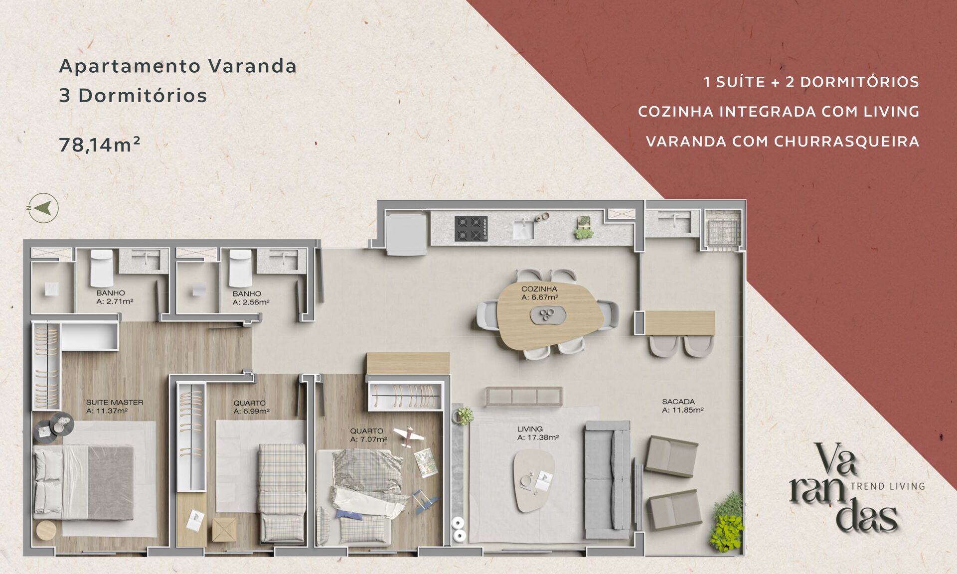 Procurando um apartamento dos sonhos em Canoas-RS? Esse aqui é pra você! Com 3 dormitórios, sendo 1 suíte, e 2 banheiros, essa belezinha tem tudo o que você precisa. Com uma área privativa de 78,14m², churrasqueira e gás central, é o lugar perfeito para reunir a galera e fazer aquele churrasco de respeito. Planta com opção Garden.