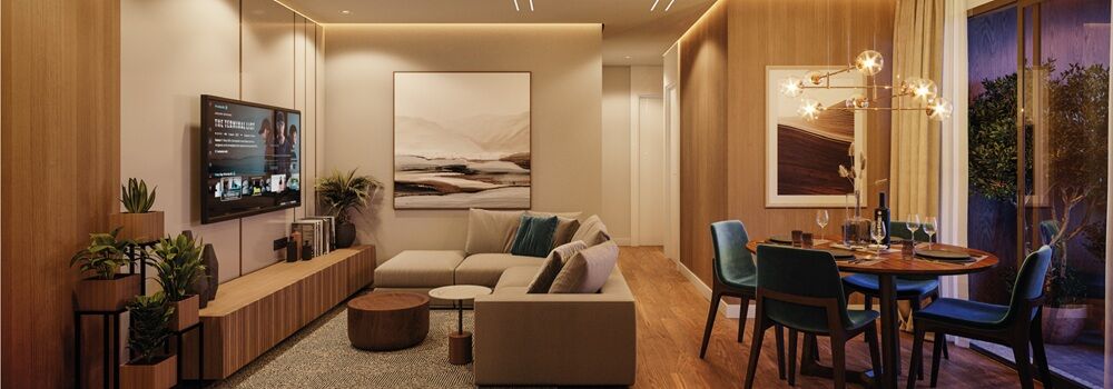 Apartamentos de 1 dormitório e áreas de convivência independentes em cada torre.
