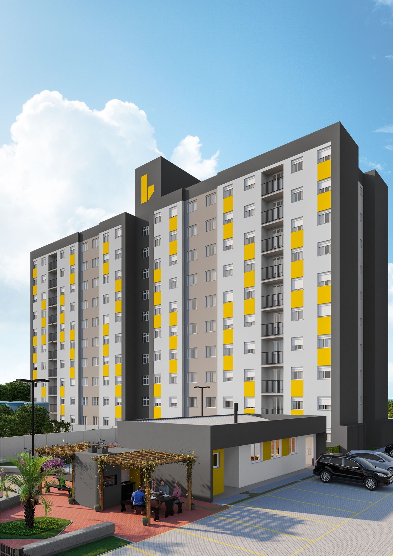 Áreas de Uso Comum: Salão de festas com churrasqueira, Playground, Piscinas adulto e infantil, Espaço Pet e PetCare, Bicicletário, Quiosques com churrasqueira;